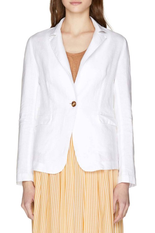 Детали: Классический жакет из льна. Однотонная модель, длинные рукава, отложной воротник с лацканами, по бокам карманы с клапанами. Спереди застегивается на пуговицу