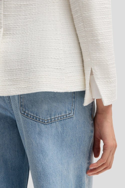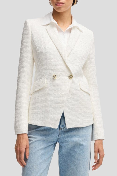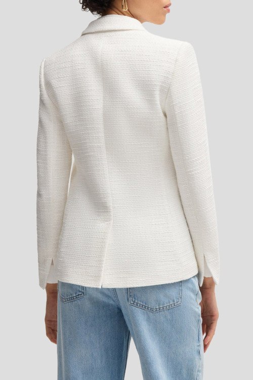 Детали: Женский белый твидовый жакет Jatawa2 от Hugo Boss (Хуго Босс). Двубортный фасон, передние карманы с клапаном, золотистые пуговицы, классическая длина