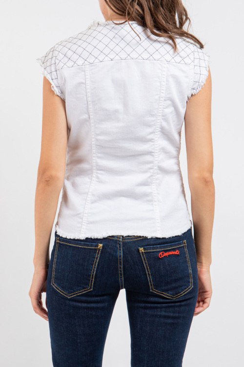 Женский белый джинсовый жилет из коттонового микса от TWINSET (Твинсет).Короткие рукава, круглый вырез под горло, застегивается спереди на металлические кнопки. Два накладных кармана на груди. Декорирован камнями.