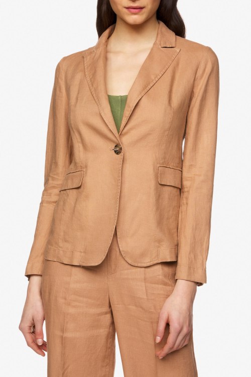 Детали: Классический жакет из льна. Однотонная модель, длинные рукава, отложной воротник с лацканами, по бокам карманы с клапанами. Спереди застегивается на пуговицу