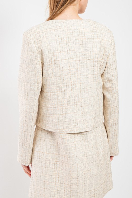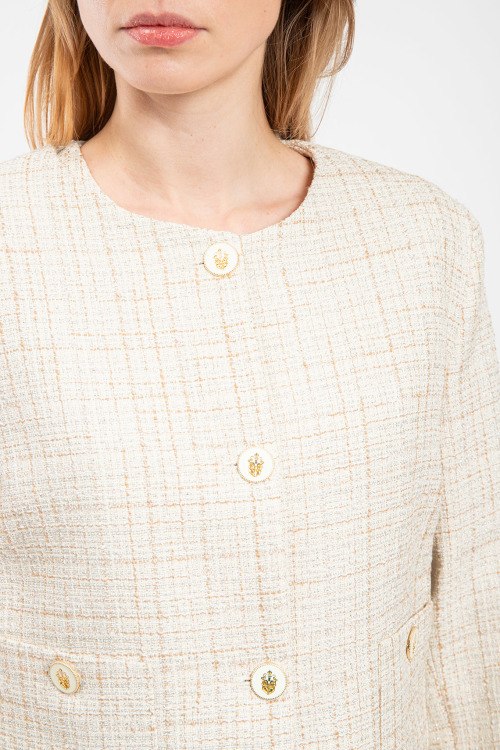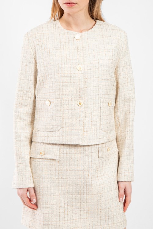 Женский бежевый жакет из вискозы, хлопка и полиэстера от Kocca (Кокка). Круглый вырез горловины, застежка на пуговицы, дизайн в клетку, накладные карманы, длинные рукава.