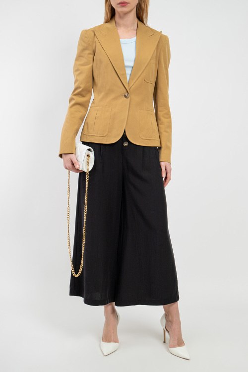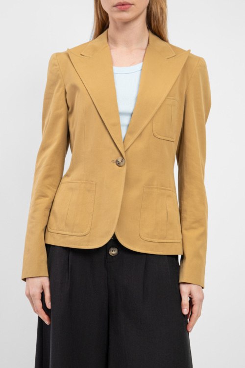 Женский бежевый хлопковый жакет от Ralph Lauren (Ральф Лорен). Однобортный фасон, отложной воротник с заостренными лацканами, три передних накладных кармана, застежка на одну пуговицу, классическая длина.