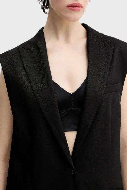 Детали: Женский черный льняной жилет от Hugo by Hugo Boss (Хуго бай Хуго Босс). Модель без рукавов, отложной воротник, три кармана, застежка на две пуговицы, удлиненная длина