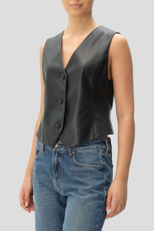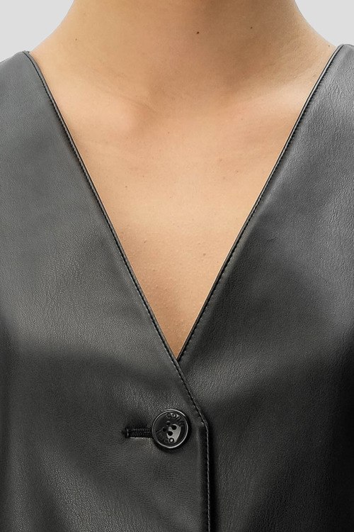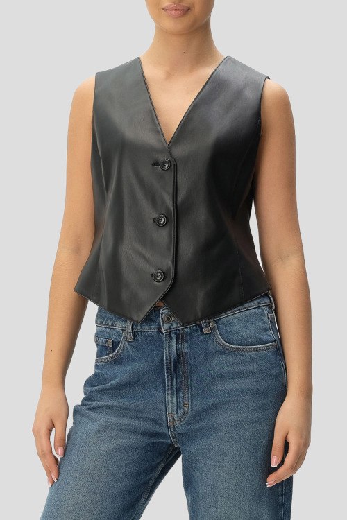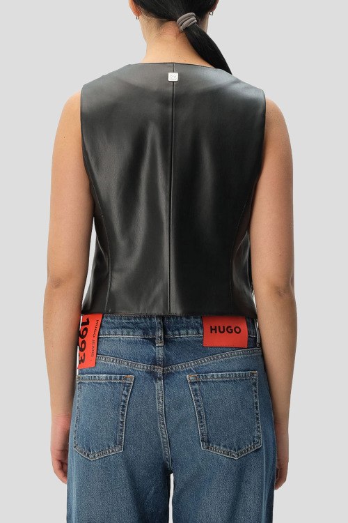 Детали: Женский черный жилет из экокожи от Hugo by Hugo Boss (Хуго бай Хуго Босс). V-образный вырез горловины, застежка на пуговицы, без рукавов, патч-лого