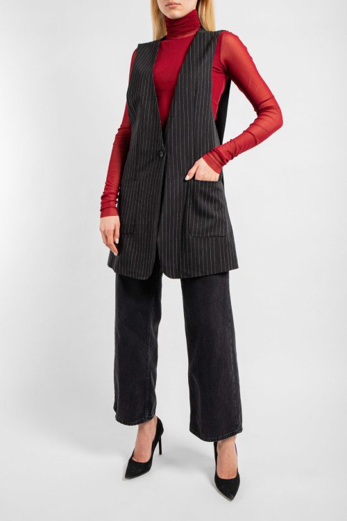 Женский черный жилет из микса полиэстера и вискозы от Imperial (Империал). Удлиненная модель без рукавов, приталенный фасон, глубокий V-образный вырез, спереди два накладный кармана, застегивается на пуговицу, дизайн в полоску по всей поверхности