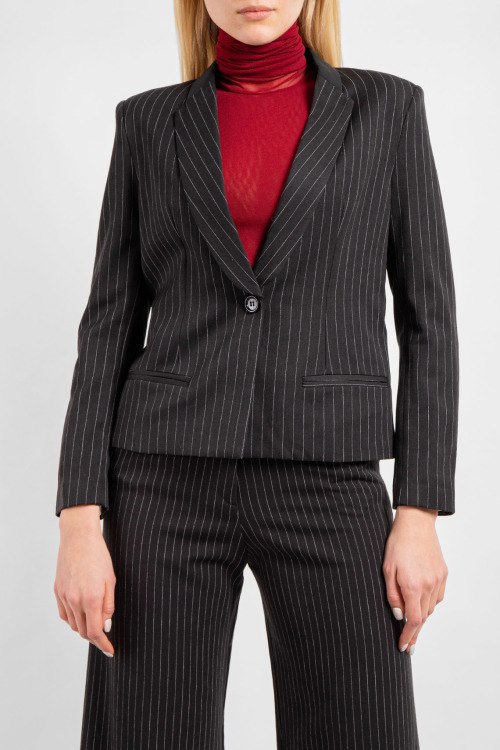 Детали: Женский черный жакет из микса полиэстера и вискозы от Imperial (Империал). Классическая длина, прямой фасон, длинные рукава с пуговицами на манжетах, отложной воротник с глубоким V-образным вырезом, два внешний кармана, застегивается на пуговицу