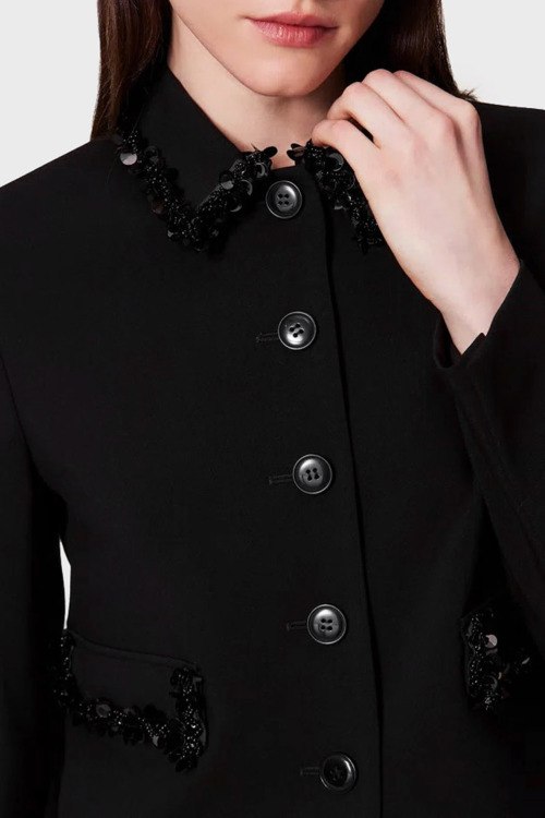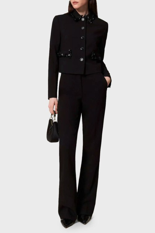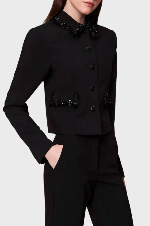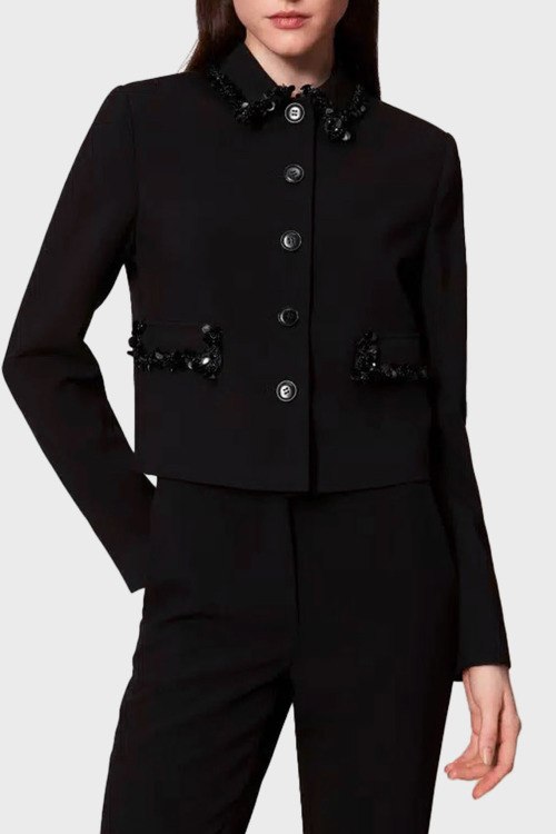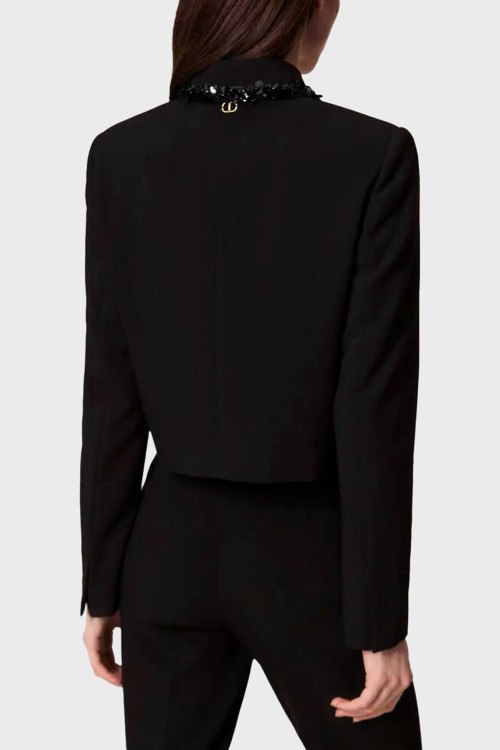 Детали: Женский черный жакет от TWINSET (Твинсет). Отложной воротник с пайетками, два передних клапана с пайетками, застежка на пуговицы, укороченная длина