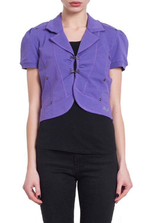 Детали: Однотонный жакет с коротким рукавом. Декорирован заклепками и фирменным логотипом, застегивается на крючки. Размер на модели - М