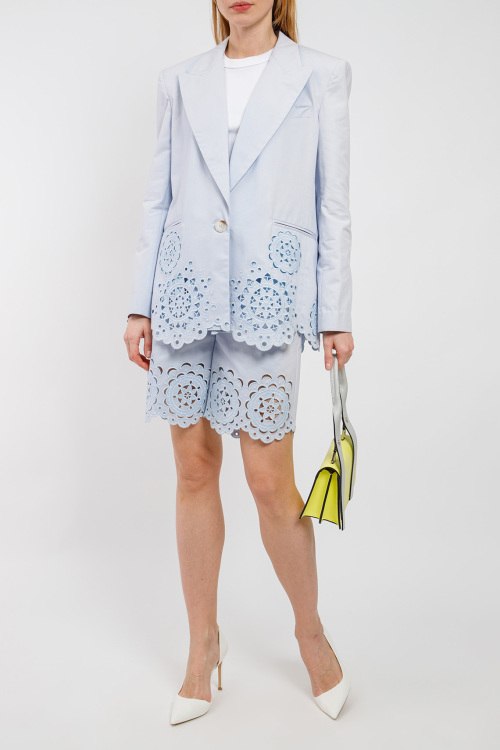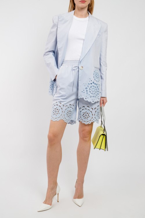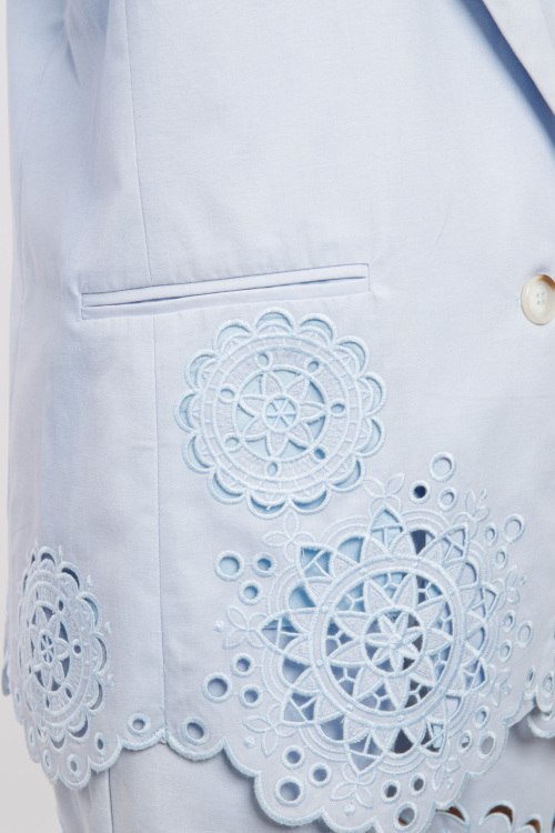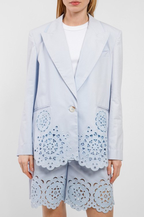 Женский голубой жакет из хлопка от Isabelle Blanche (Изабель Бланш). Отложной воротник, застежка на пуговицу, длинные рукава, перфорированный низ изделия, прорезные карманы, длинные рукава, манжеты на пуговицах.