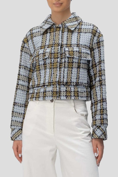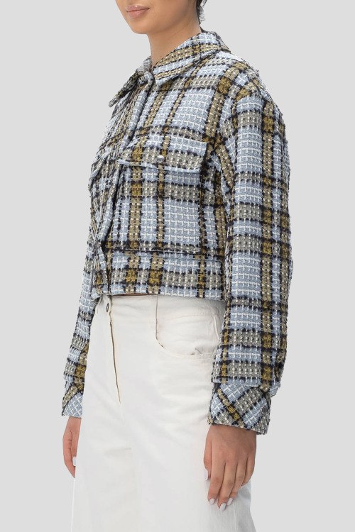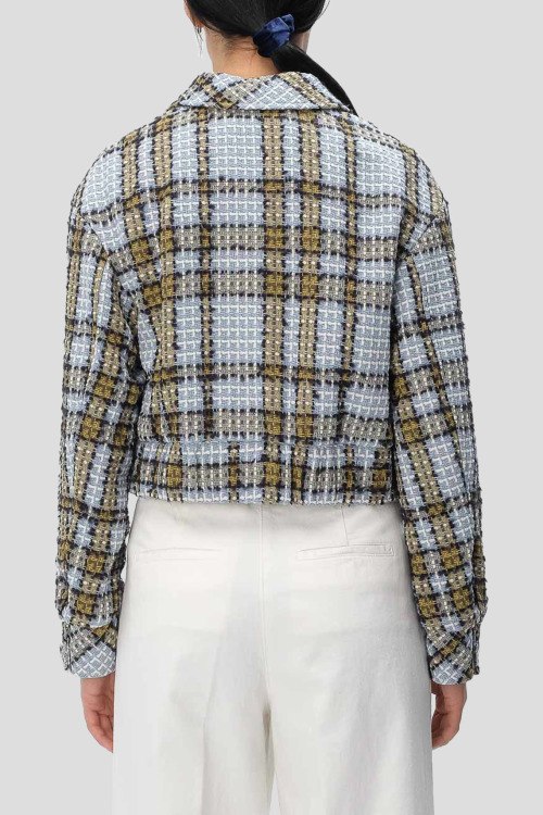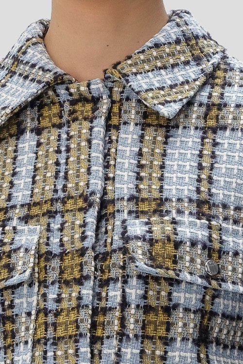 Детали: Женский голубой жакет Jatwedi из хлопкового микса от Hugo Boss (Хуго Босс). Короткая длина, классический воротник, застежка крючки, дизайн в клетку, нагрудные карманы с клапаном, длинные рукава