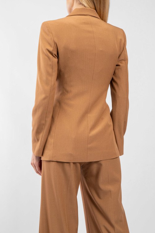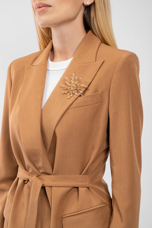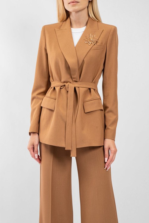 Женский жакет цвета кэмел от Kocca (Кокка). Отложной воротник с заостренными лацканами, декор золотистой брошью, три кармана, в талии с поясом в тон изделия, удлиненная длина. Вы можете дополнить свой образ широкими брюками цвета кэмел.