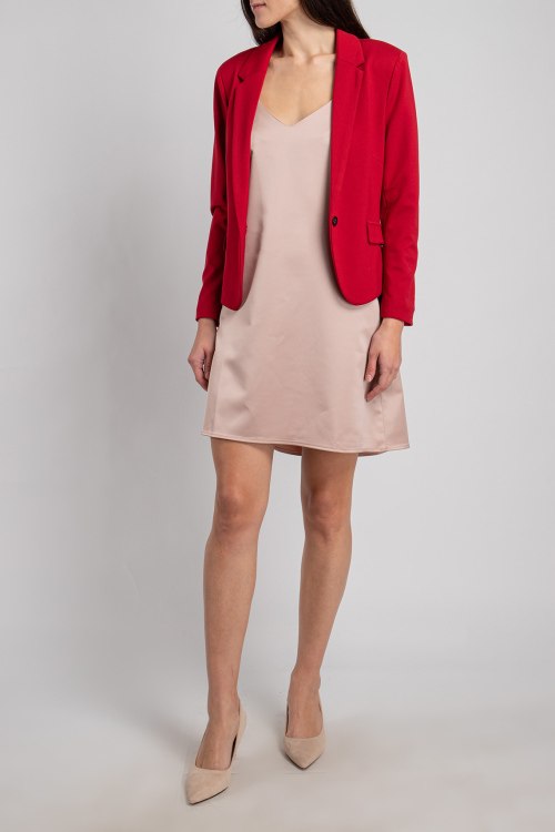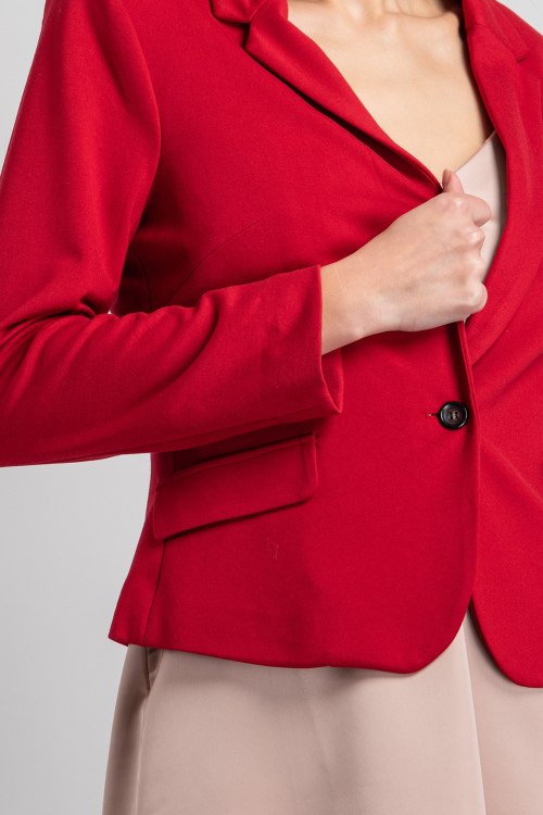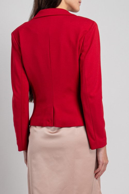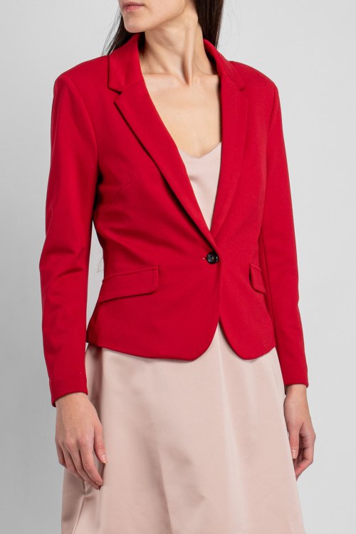 Женский красный жакет из вискозного микса от Silvian Heach (Сильвиан Хич). Классическая длина, отложной воротник, застежка на пуговицу, длинные рукава, карманы с клапаном.