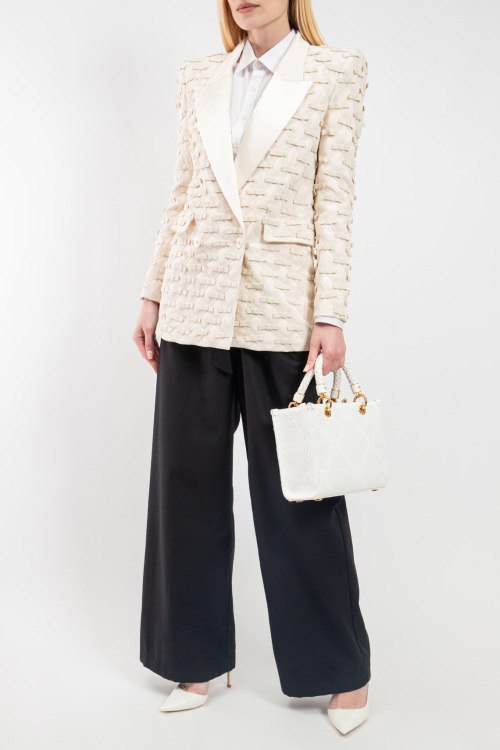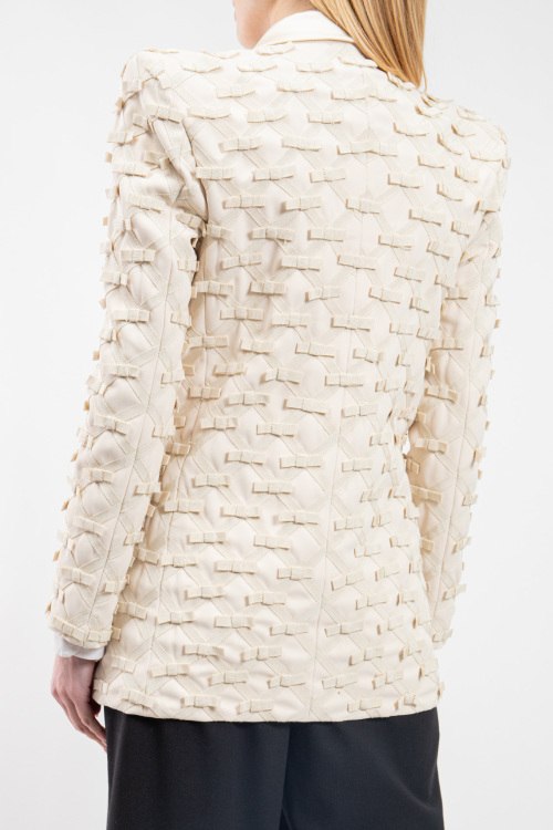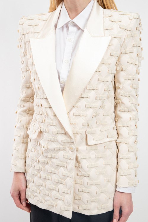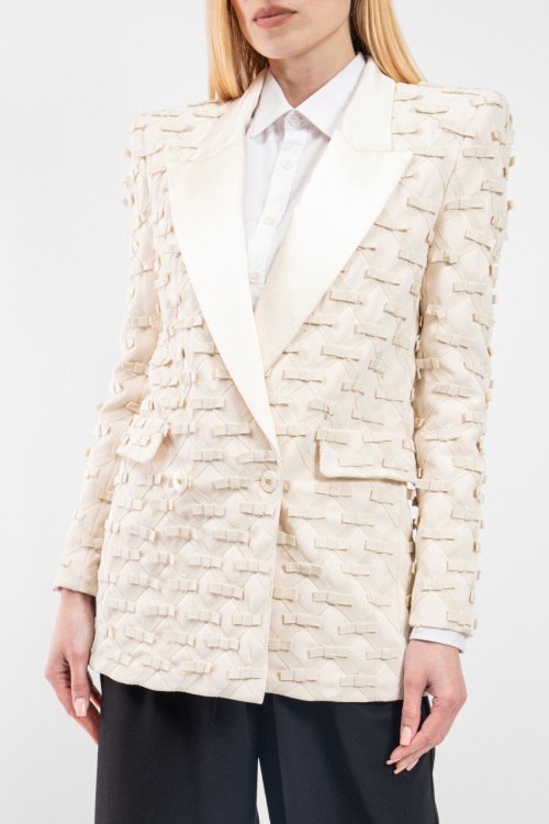 Женский кремовый жакет от Elisabetta Franchi (Елизабетта Франчи). Двубортный фасон, отложной воротник с заостренными лацканами, структурированные плечи, декор мотивом с ромбами и вышитыми бантиками, карманы с клапаном, застежка на одну пуговицу.
