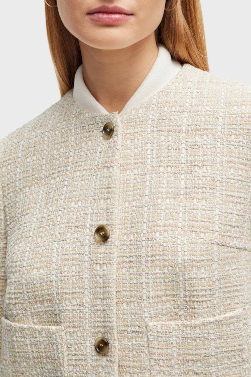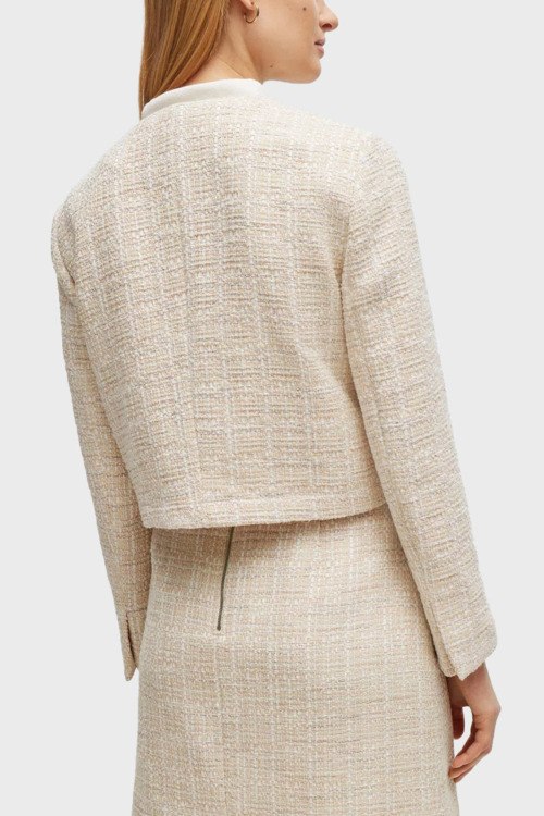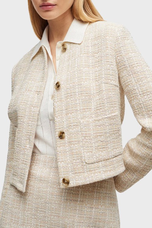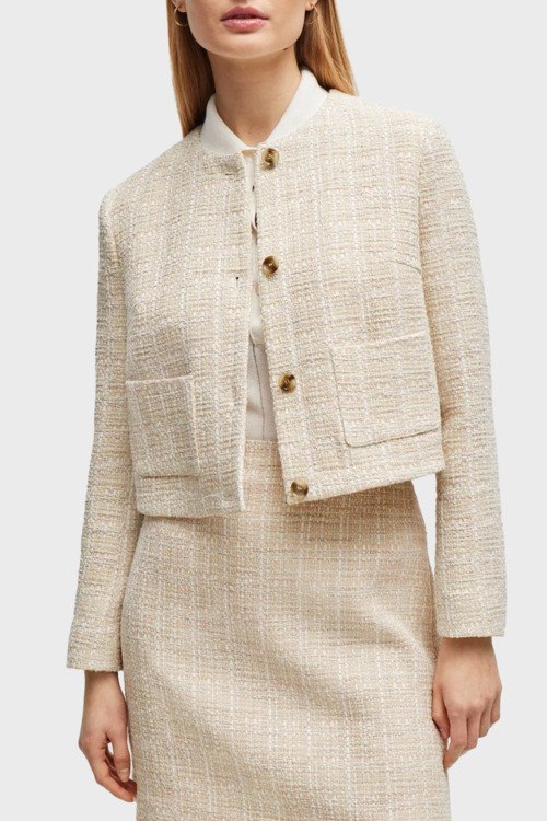 Детали: Женский кремовый твидовый жакет Janoa4 от Hugo Boss (Хуго Босс). Круглый вырез горловины, два накладных кармана, застежка на пуговицы, укороченная длина