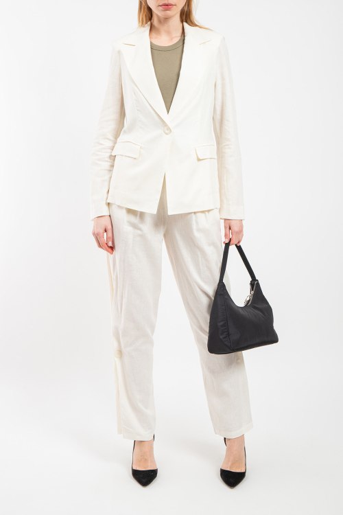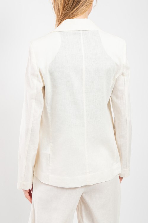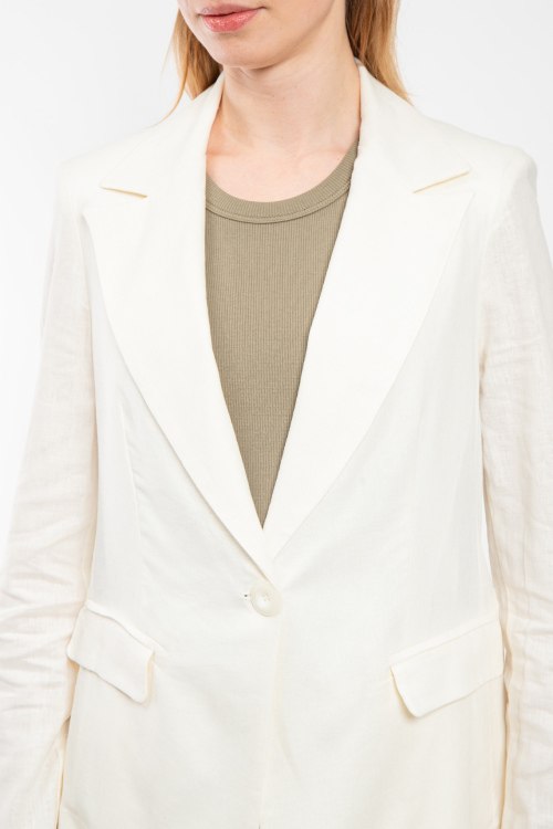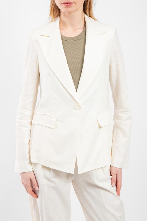 Женский жакет молочного оттенка из льна и вискозы от J.B4 Just Before (Джаст Бифо). Отложной воротник, застежка на пуговицу, карман с клапаном, длинные рукава.