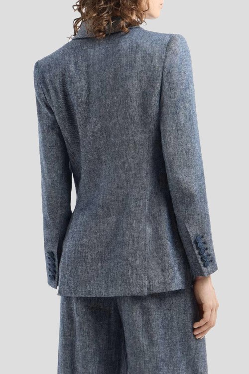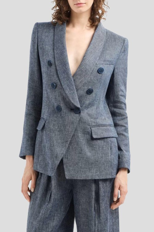 Детали: Женский серо-синий льняной жакет от Emporio Armani (Эмпорио Армани). Двубортный фасон, отложной воротник, три кармана, застежка на пуговицы, классическая длина