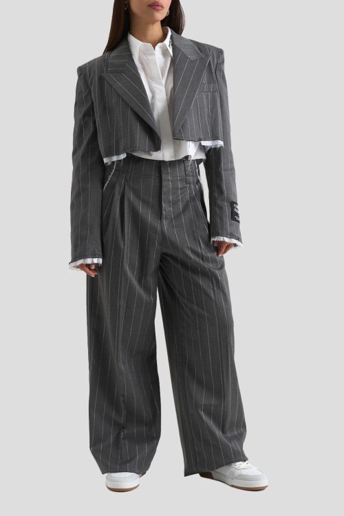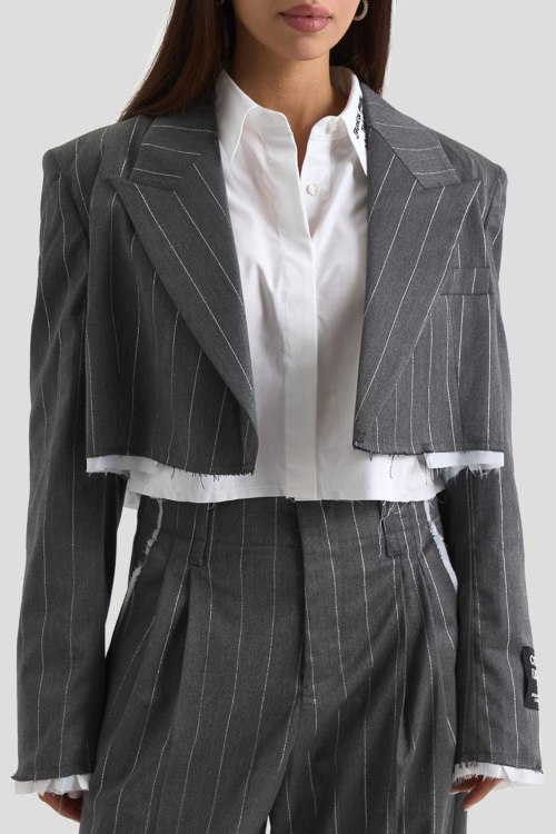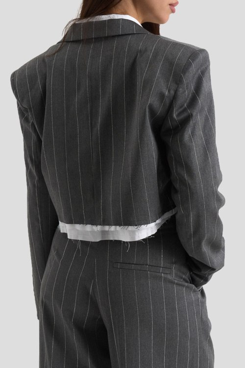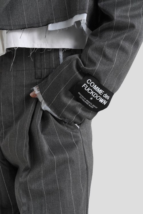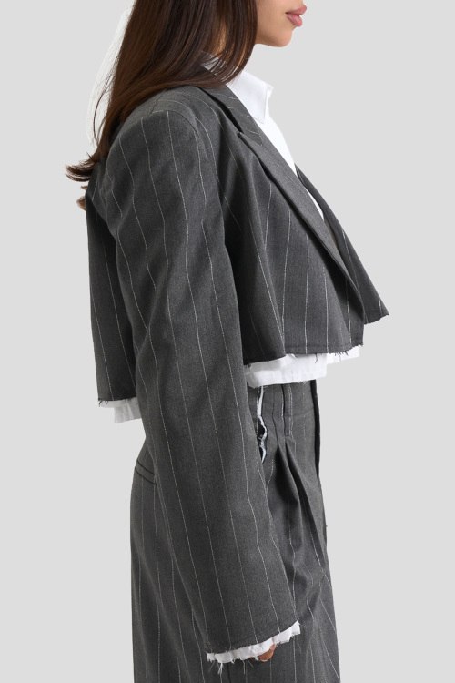 Детали: Женский серый жакет из полиэстера и вискозы от Comme des Fuckdown (Камм дес Факдаун). Укороченная модель, отложной воротник, без застежки, дизайн в полоску, необработанные края