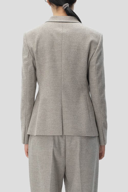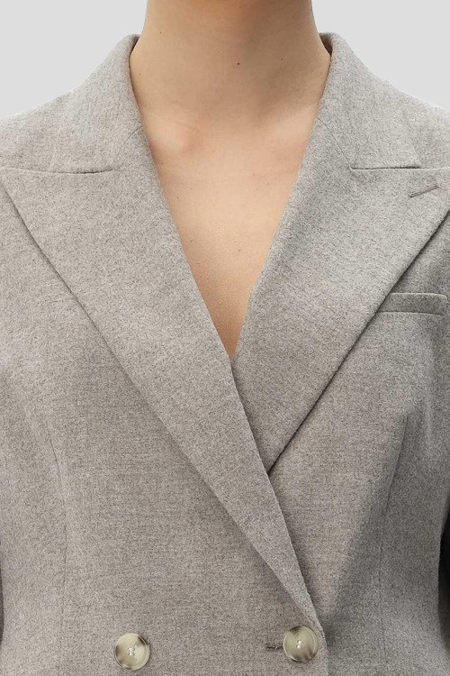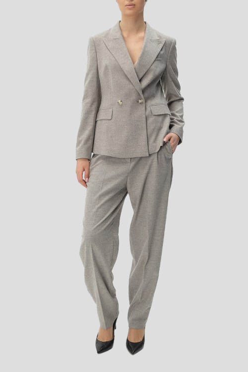 Детали: Женский серый двубортный жакет из шерстяного микса от Hugo Boss (Хуго Босс). Отложной воротник, застежка на пуговицы, длинные рукава, карманы с клапаном