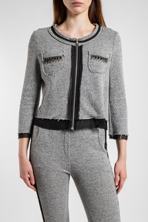 Детали: Женский серый жакет из хлопкового и вискозного микса от Imperial (Империал). Два декорированных кармана на груди, круглый вырез горловины, застежка-молния, укороченный рукав, необработанные нижние края