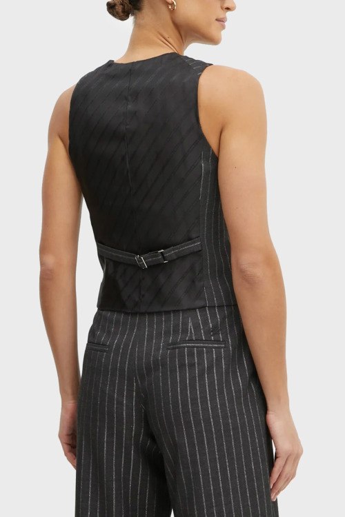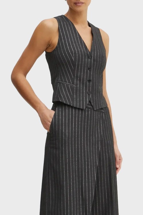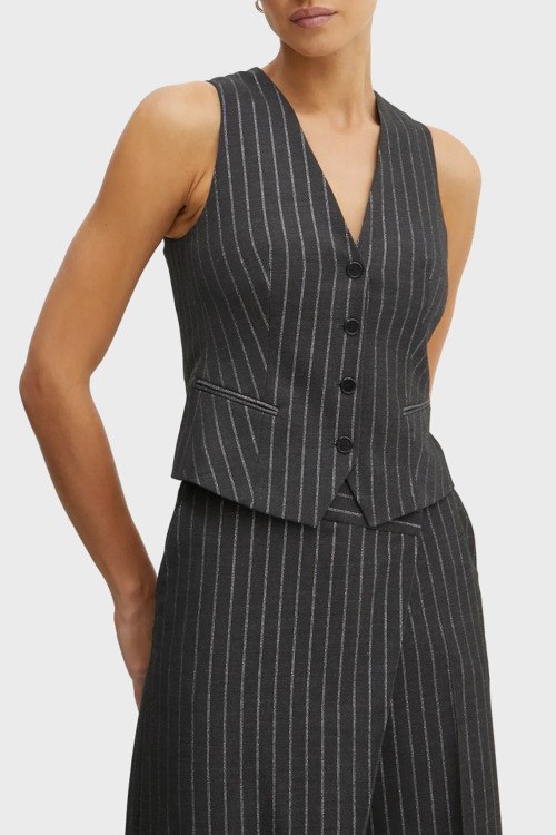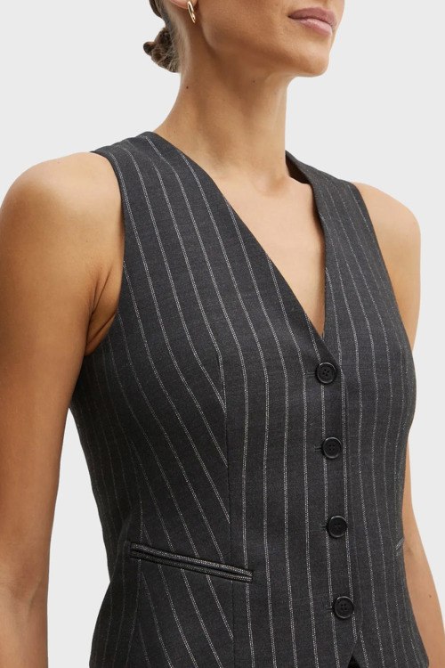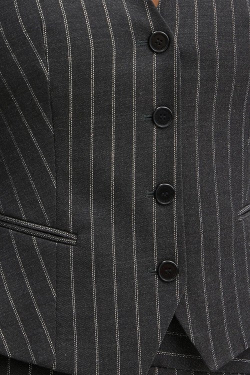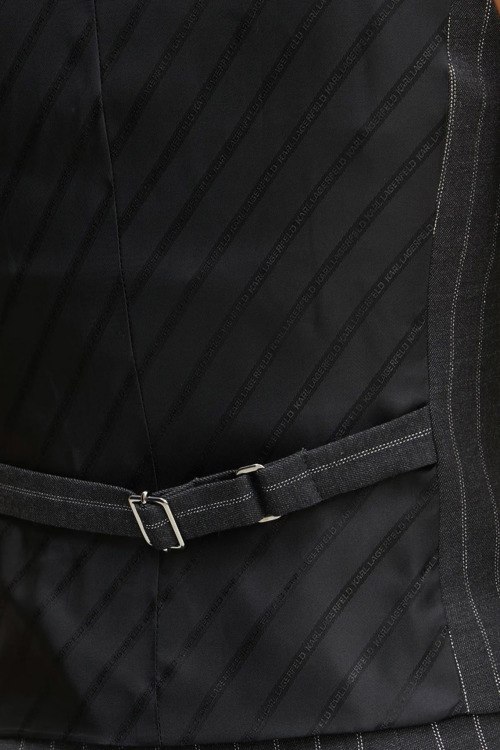 Детали: Женский серый жилет из шерстяного микса от Karl Lagerfeld (Карл Лагерфельд). V_образный вырез горловины, застежка на пуговицы, без рукавов, комбинация материалов, модель в вертикальную полоску