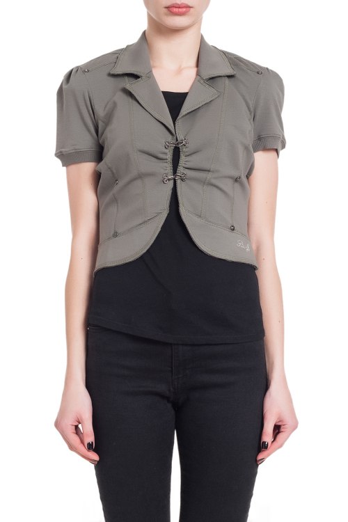 Детали: Однотонный жакет с коротким рукавом. Декорирован заклепками и фирменным логотипом, застегивается на крючки. Размер на модели - S