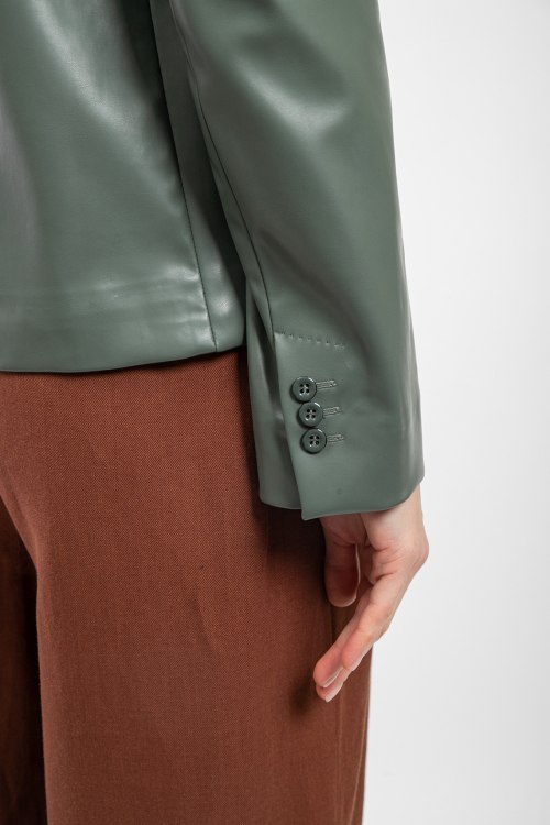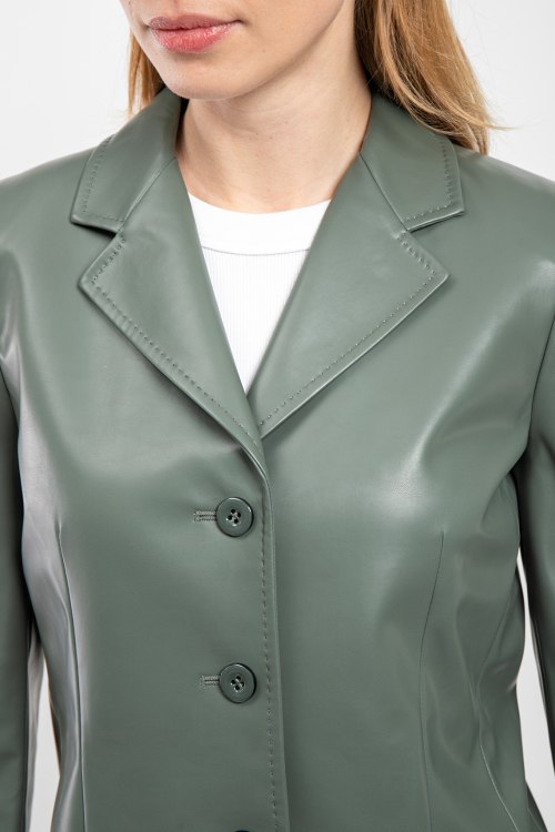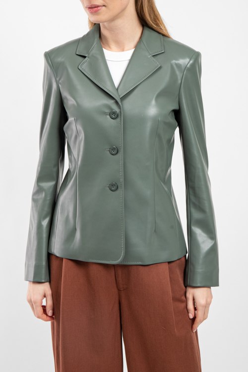 Женский серо-зеленый жакет из экокожи Lollo от Max Mara Leisure (Макс Мара Лэжэ). Отложной воротник, застежка на три пуговицы, классическая длина.
