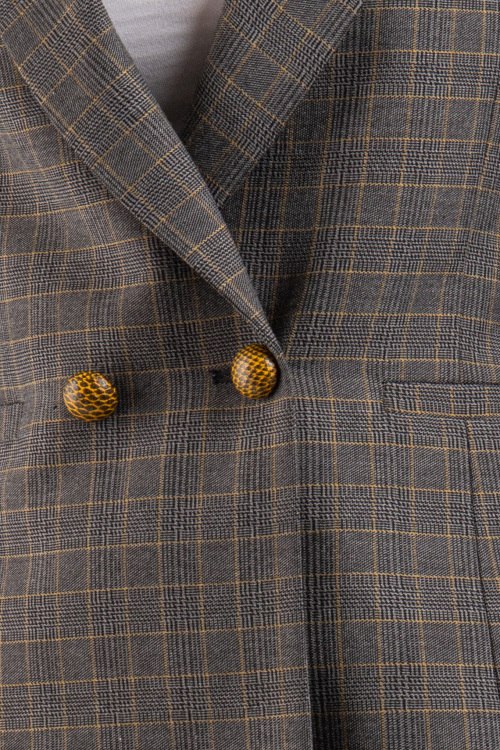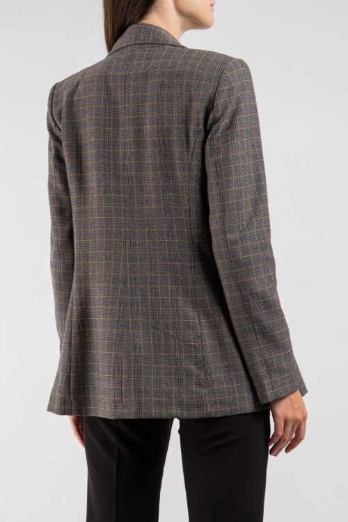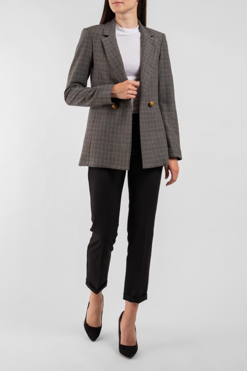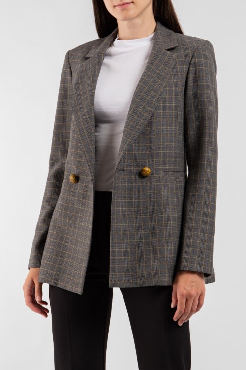 Женский серый жакет от Think & Believe (Синк & Белив). Принт в клетку, отложной воротник, передние прорезные карманы, застегивается пуговицу.