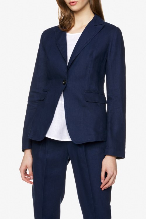 Детали: Классический жакет из льна. Однотонная модель, длинные рукава, отложной воротник с лацканами, по бокам карманы с клапанами. Спереди застегивается на пуговицу