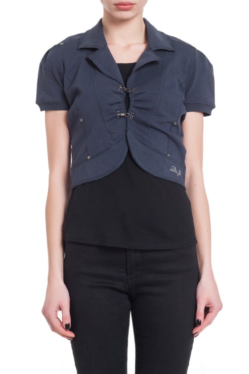 Детали: Однотонный жакет с коротким рукавом. Декорирован заклепками и фирменным логотипом, застегивается на крючки. Размер на модели - S