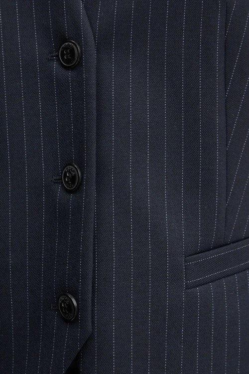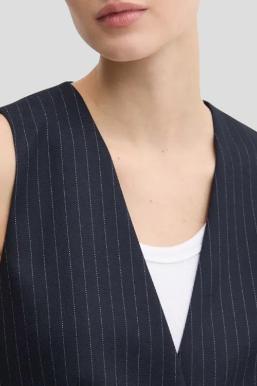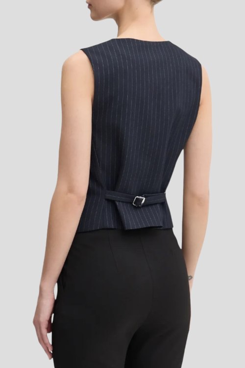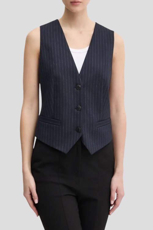 Детали: Женский темно-синий жилет Aumara-2 от Hugo by Hugo Boss (Хуго бай Хуго Босс). V-вырез горловины, застежка на пуговицы, асимметричный низ, дизайн в мелкую полоску