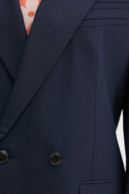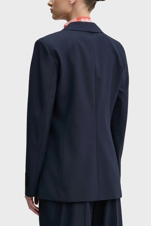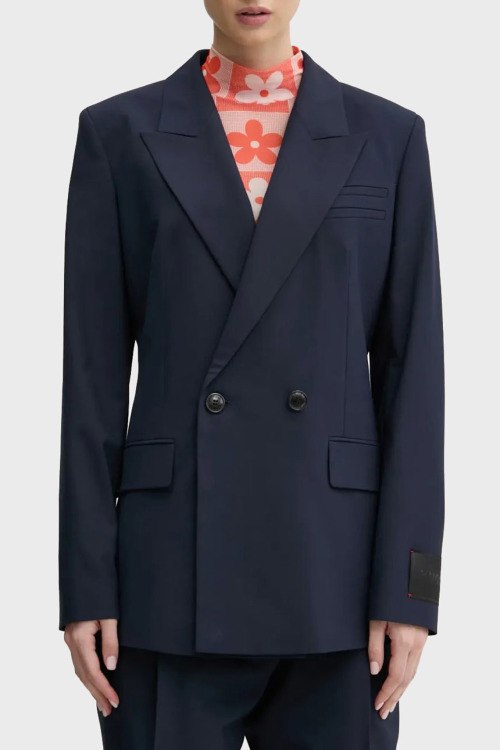 Детали: Женский темно-синий жакет Akisa из вискозного микса от Hugo Boss (Хуго Босс). Двубортная застежка на пуговицы, отложной воротник, карманы с клапаном