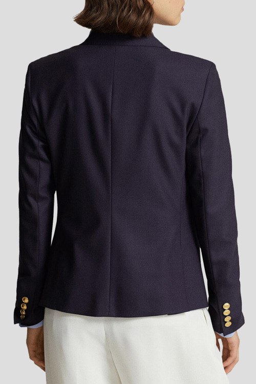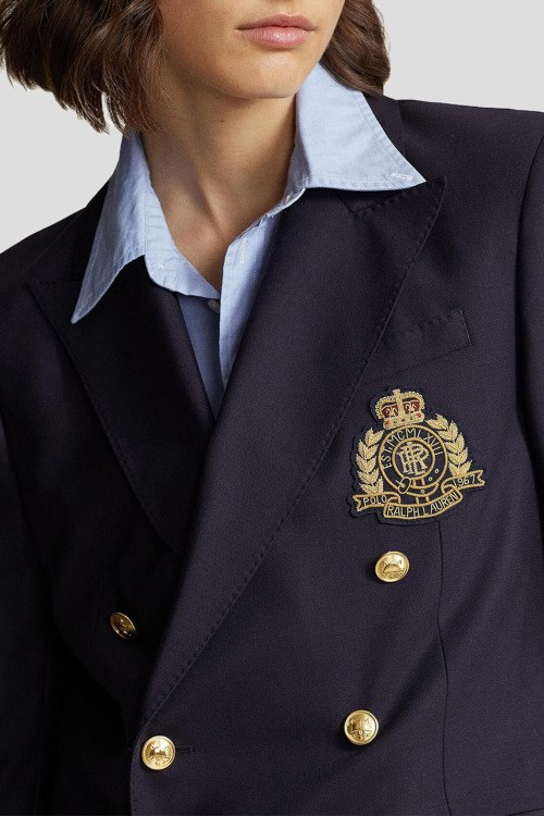 Детали: Женский темно-синий шерстяной жакет от Polo Ralph Lauren (Поло Ральф Лорен). Двубортный фасон, нашивка с эмблемой на груди, три кармана, застежка на золотистые пуговицы, классическая длина