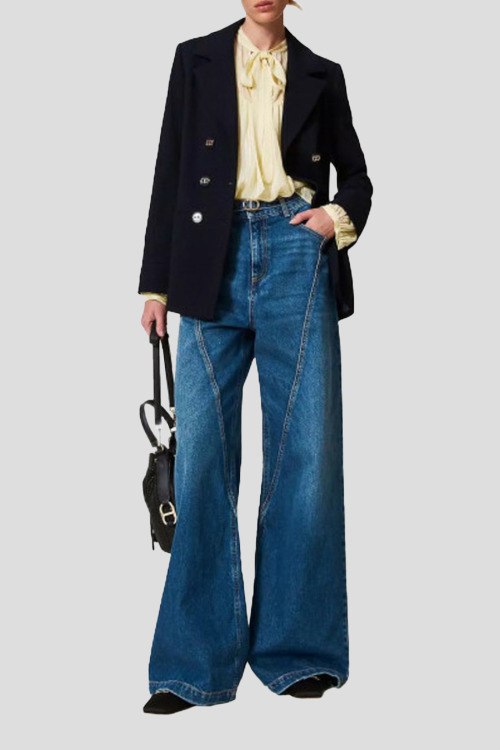 Детали: Женский темно-синий жакет от TWINSET (Твинсет). Двубортный фасон, отложной воротник, накладные карманы, пуговицы с логотипом Oval T, классическая длина