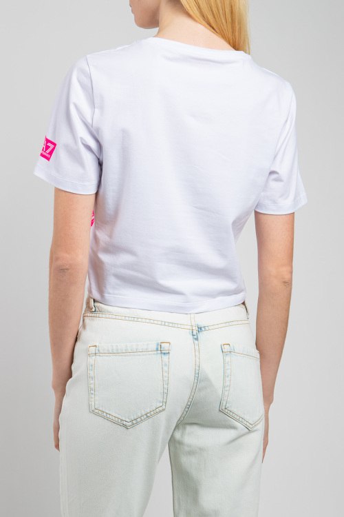 Женский белый топ из хлопка от EA7 Emporio Armani (EA7 Эмпорио Армани). Круглый вырез горловины, короткие рукава, яркий принт с логотипом бренда.