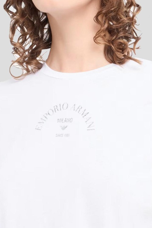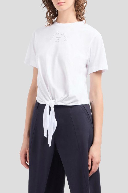 Детали: Женская белая хлопковая футболка от Emporio Armani (Эмпорио Армани). Логотип на груди, круглый вырез горловины, короткий рукав, нижний край на завязках