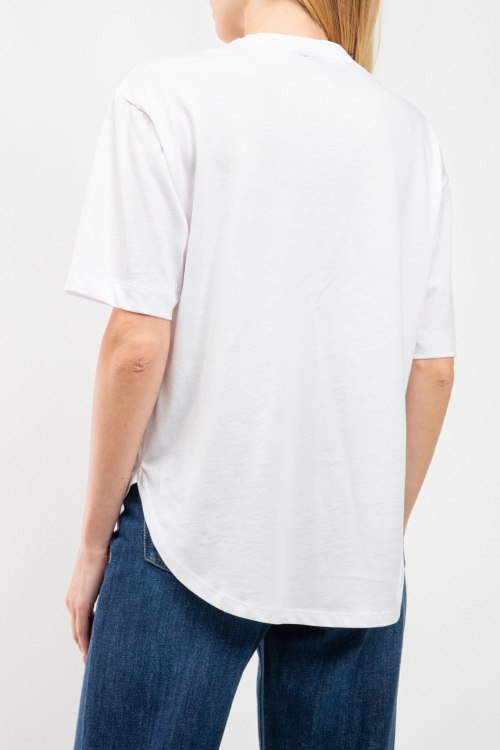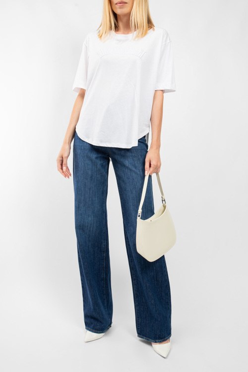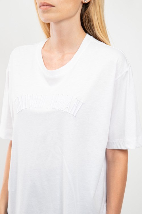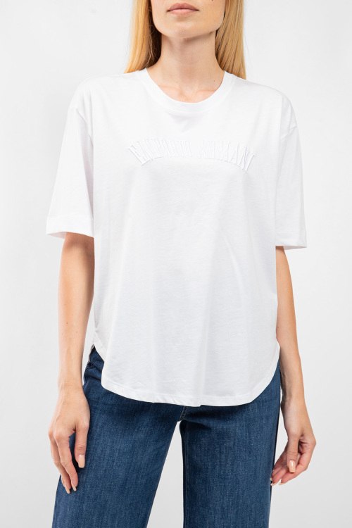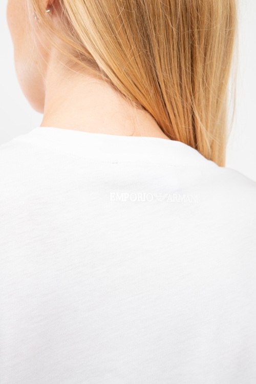 Женская белая хлопковая футболка от Emporio Armani (Эмпорио Армани). Вышитый логотип на груди, круглый вырез горловины, короткий рукав, закругленный нижний край.