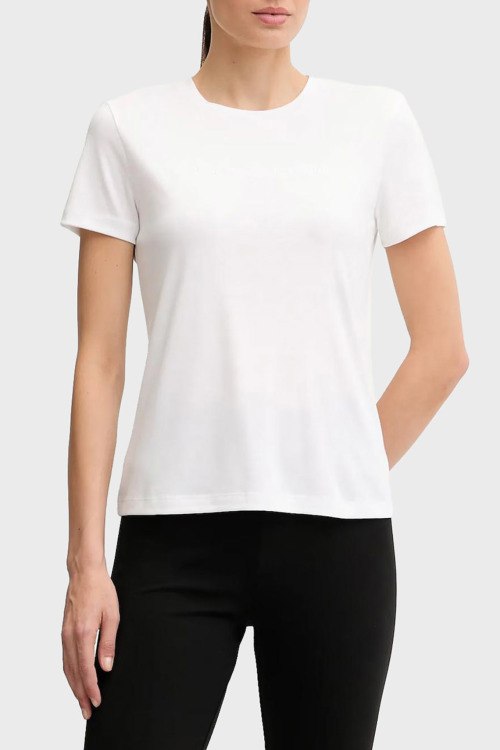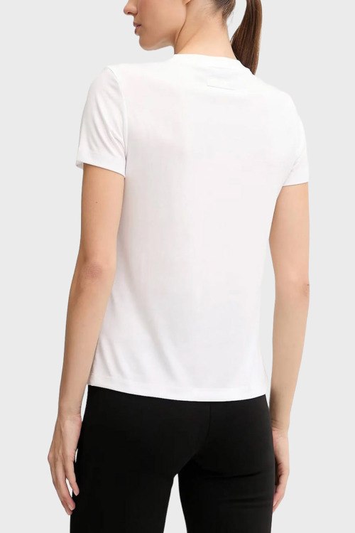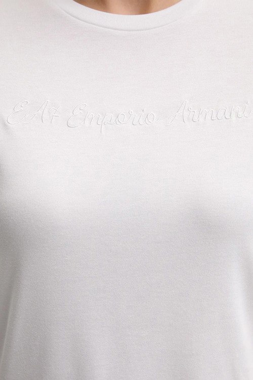 Детали: Женская белая футболка из вискозы от EA7 Emporio Armani (ЕА7 Эмпорио Армани). Логотип на груди, круглый вырез горловины, короткий рукав, классическая длина