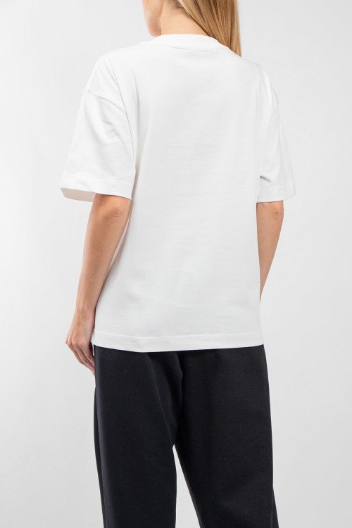 Женская белая хлопковая футболка от Balenciaga (Баленсиага). Логотип на груди с металлическими заклепками, круглый вырез горловины, короткий рукав, классическая длина.