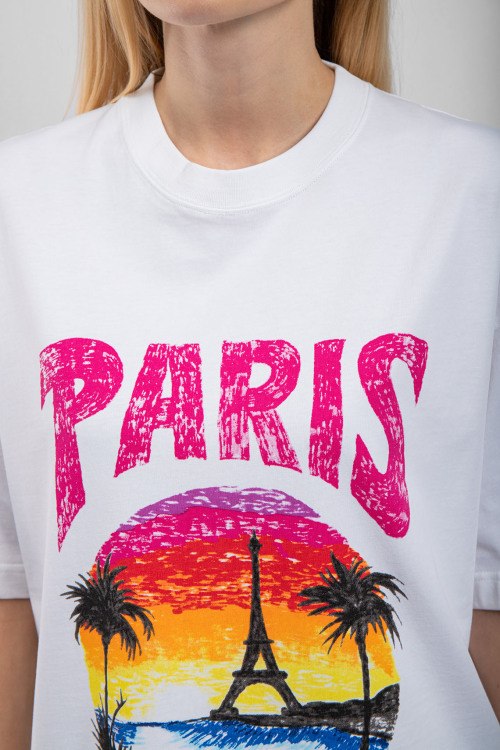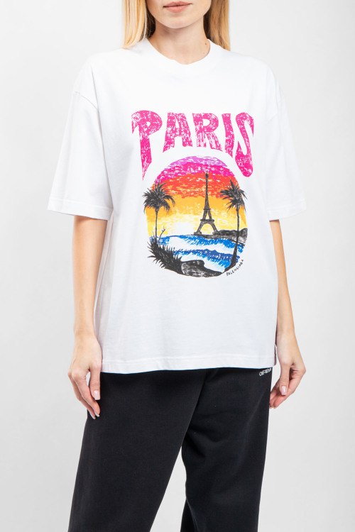 Детали: Женская белая хлопковая футболка Paris от Balenciaga (Баленсиага). Принт на груди, логотип на спине, круглый вырез горловины, короткий рукав, удлиненная длина