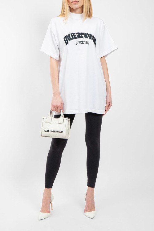 Женская белая хлопковая футболка от Balenciaga (Баленсиага). Вышитый логотип на груди, фасон oversize, круглый вырез горловины, короткий рукав, удлиненная длина.