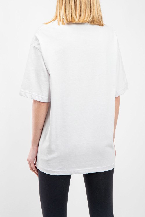 Женская белая футболка из хлопка от Balenciaga (Баленсиага). Круглый вырез горловины, фасон oversize, короткие рукава, дизайн с вышитым логотипом на груди Замеры для размера на фото: S; длина - 74 см; ПОГ - 55,5 см; ПОТ - 55 см; ПОБ - 55 см; длина по внутреннему шву рукава - 13 см; ширина рукава - 23 см.