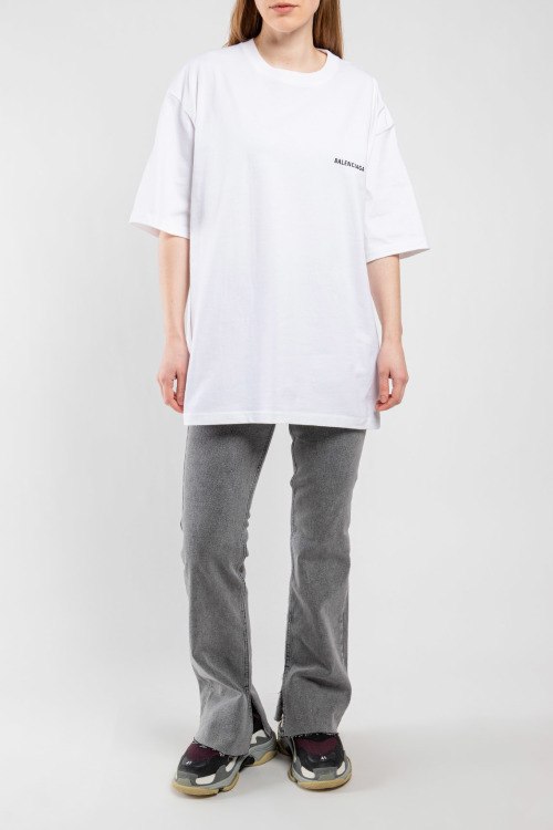 Женская белая хлопковая футболка от Balenciaga (Баленсиага). Фасон oversize, принт с логотипом на груди и на спине, круглый вырез горловины, короткий рукав, удлиненная длина.