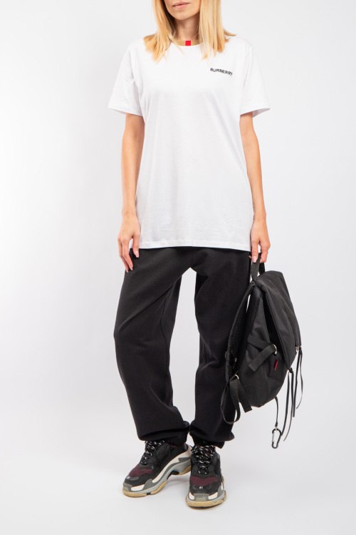 Женская белая хлопковая футболка от Burberry (Бёрберри). Фасон oversize, логотип на груди, круглый вырез горловины с фирменной отделкой, короткий рукав, удлиненная длина.