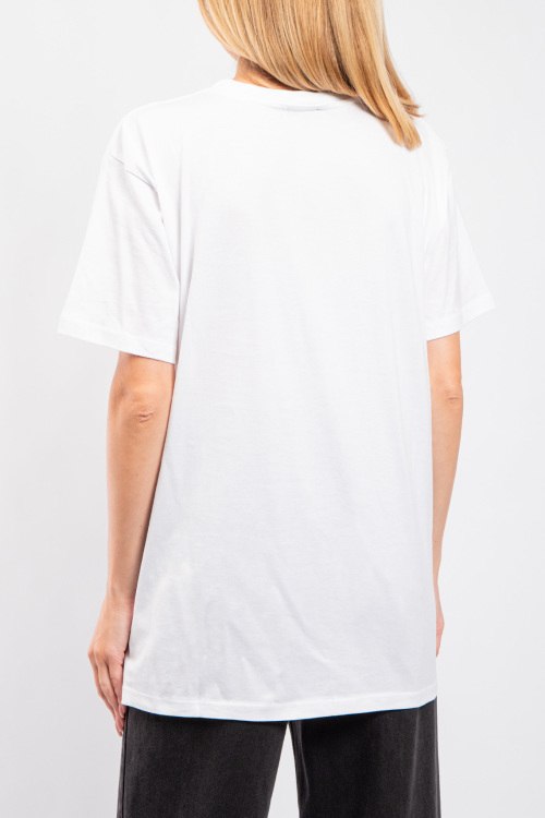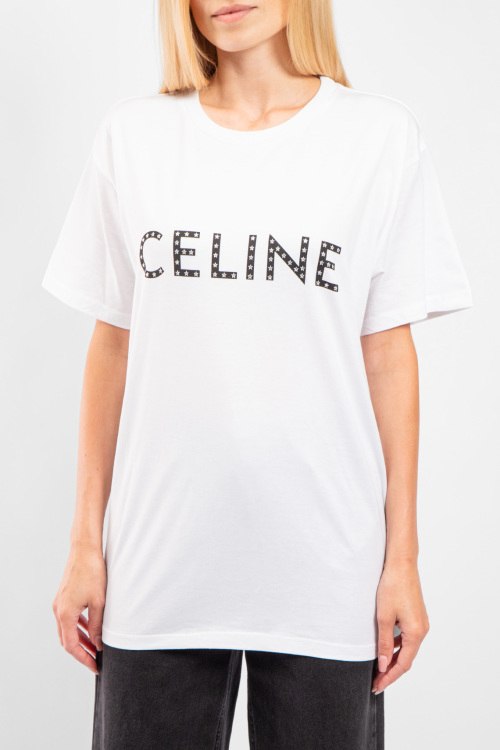 Женская белая хлопковая футболка от Celine (Селин). Фасон oversize, логотип на груди, круглый вырез горловины, короткий рукав, удлиненная длина.