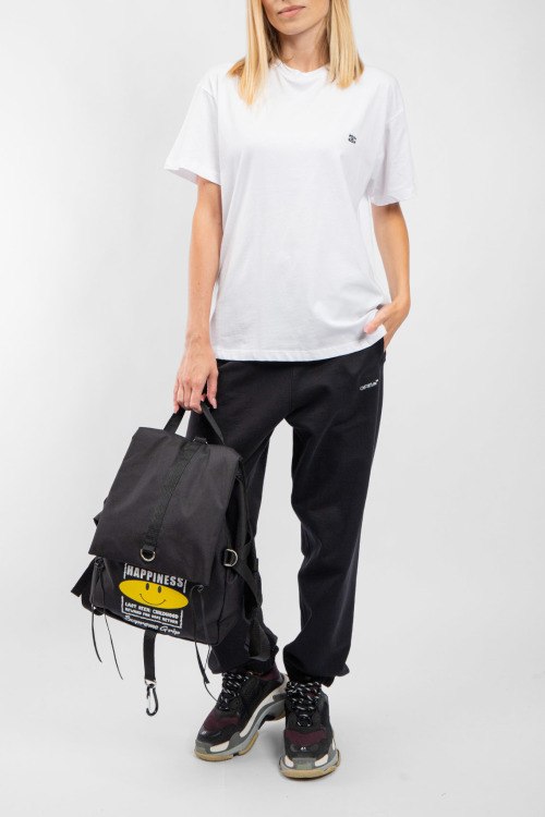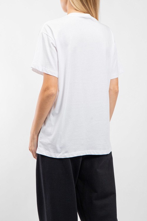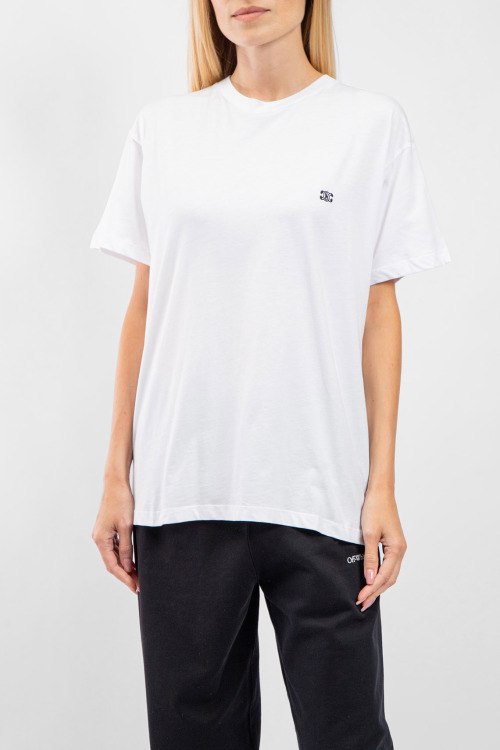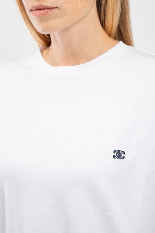 Женская белая хлопковая футболка Triomphe от Celine (Селин). Фасон oversize, логотип на груди, круглый вырез горловины, короткий рукав, удлиненная длина.