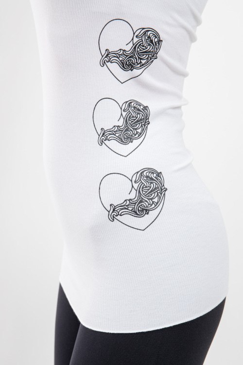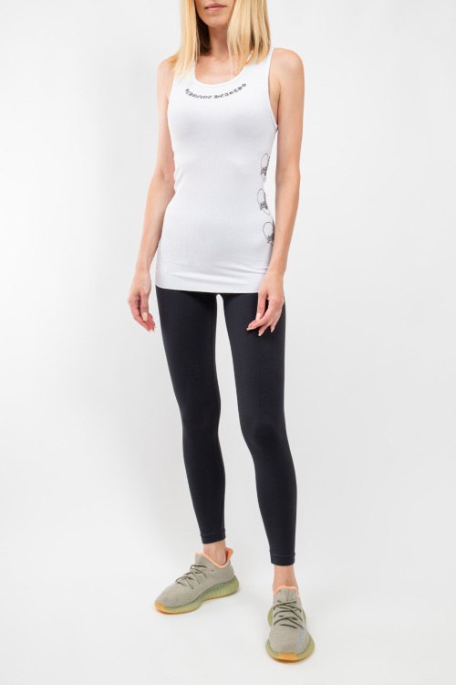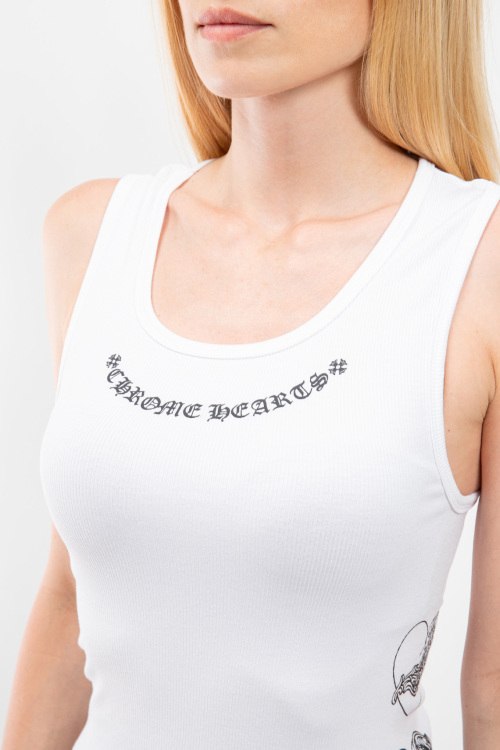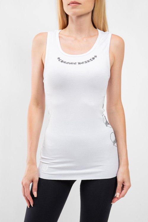 Женская белая хлопковая майка от Chrome Hearts (Хром Хартс). Модель без рукавов, дизайн в рубчик, логотип спереди и сзади, принт сбоку, удлиненная длина.