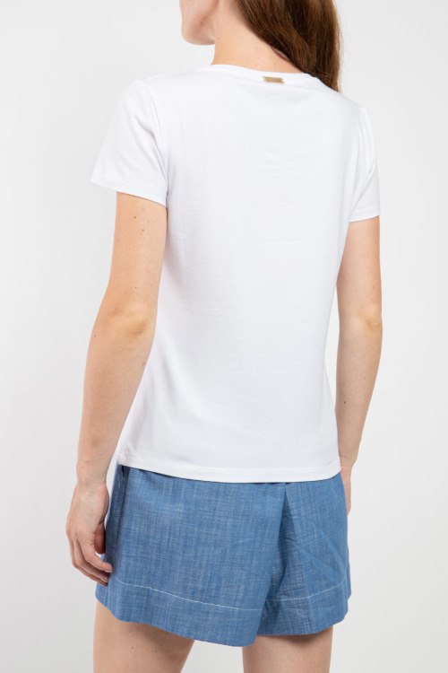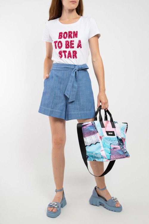 Женская белая хлопковая футболка от Clips (Клипс). Надпись "Born To Be A Star" декорирована пайетками, круглый вырез горловины, короткий рукав, классическая длина.