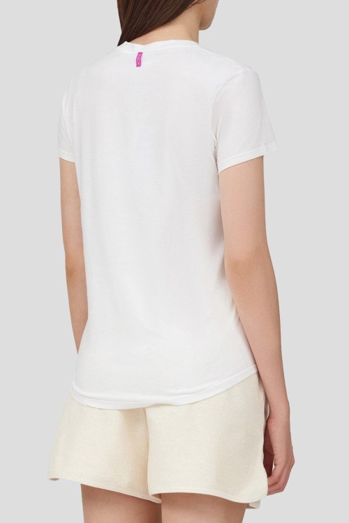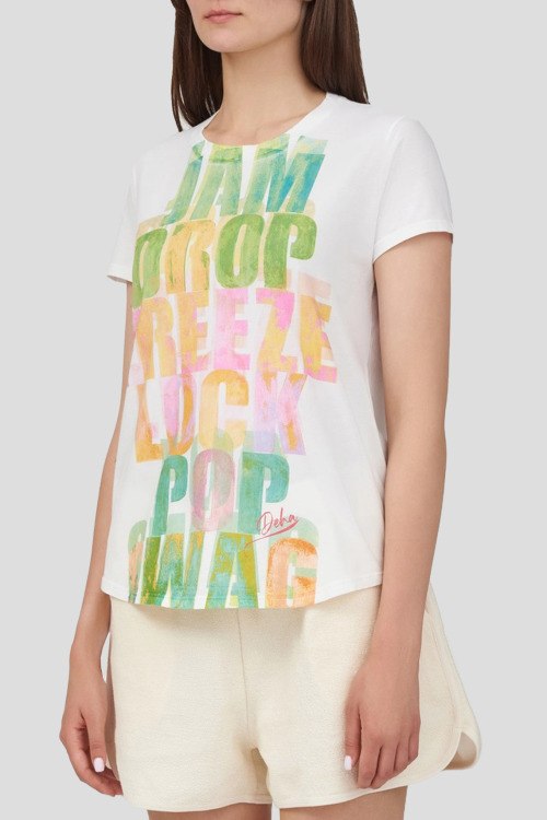 Детали: Женская белая хлопковая футболка от Deha (Деха). Принт на груди, круглый вырез горловины, короткий рукав, классическая длина. Параметры модели: 78-62-92, рост 179 см. На модели надет: M размер