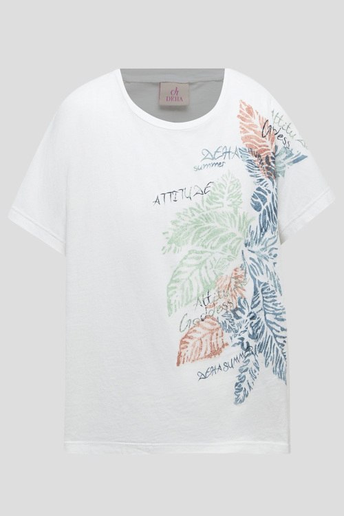 Детали: Женская белая хлопковая футболка от Deha (Деха). Принт спереди, круглый вырез горловины, короткий рукав, классическая длина. Длина рукава: короткий, для размера S - 28 см, обхват груди: для размера S - 112 см, обхват талии: для размера S - 100 см, длина изделия по среднему шву спинки от горловины: для размера S - 52 см