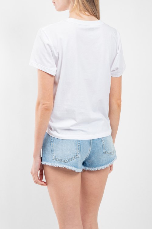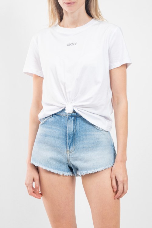 Женская белая хлопковая футболка от Donna Karan (Донна Каран). Логотип на груди, круглый вырез горловины, короткий рукав, нижний край с узлом, классическая длина.
